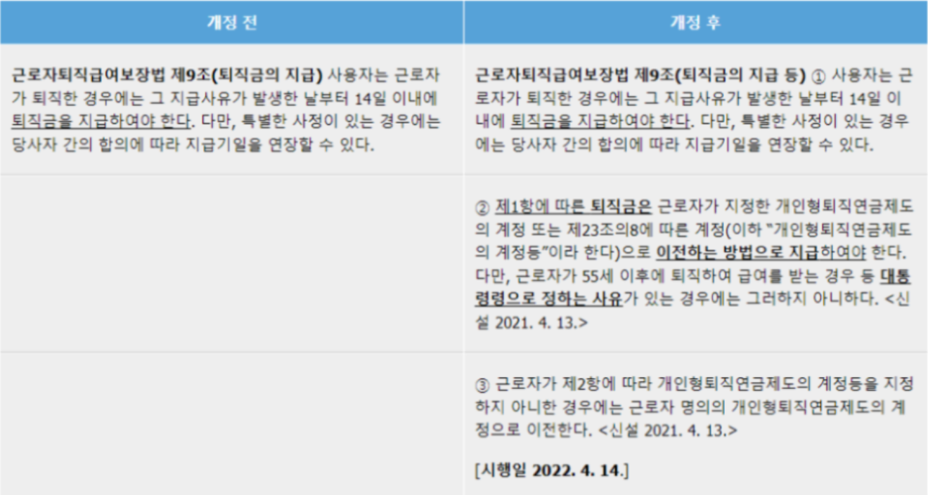 2022년 4월 14일부터 퇴직연금과 마찬가지로 개인형 퇴직연금제도 IRP로 이전하는 것이 의무화되었습니다.단, 55세 이후 퇴직한 경우나 퇴직금이 300만 원 이하인 겨우 등 일부 예외 사항에 해당하면 현행과 같이 근로자에게 직접 지급할 수 있으며 또한 사용자는 가입자에게 퇴직금 수령을 위한 개인형 IRP 계좌(퇴직금 통장)를 개설하도록 안내하고 기한 내에 세전 금액으로 지급해야 하며 지정한 IRP 계좌로 지급 시 퇴직 소득세를 공제하지 않고 세전 금액으로 전액 지급해야 합니다.