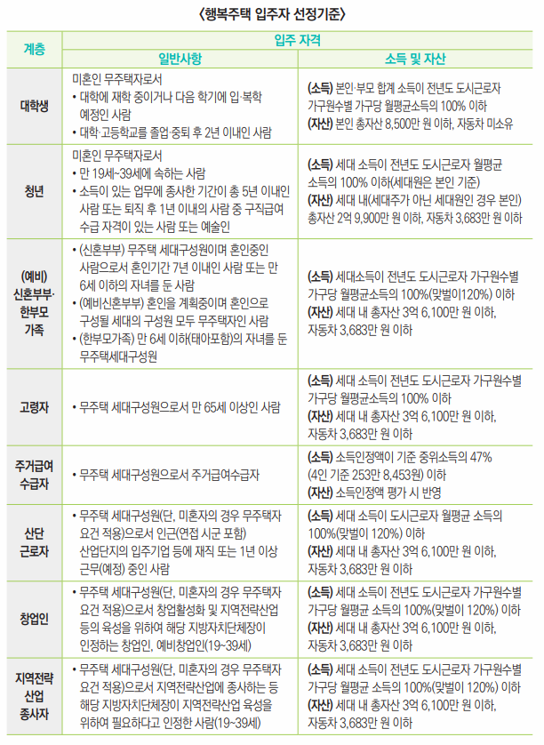 - 일반형 : 대학생·청년·신혼부부·한부모가족 80%, 주거 급여수급자, 고령자 20%