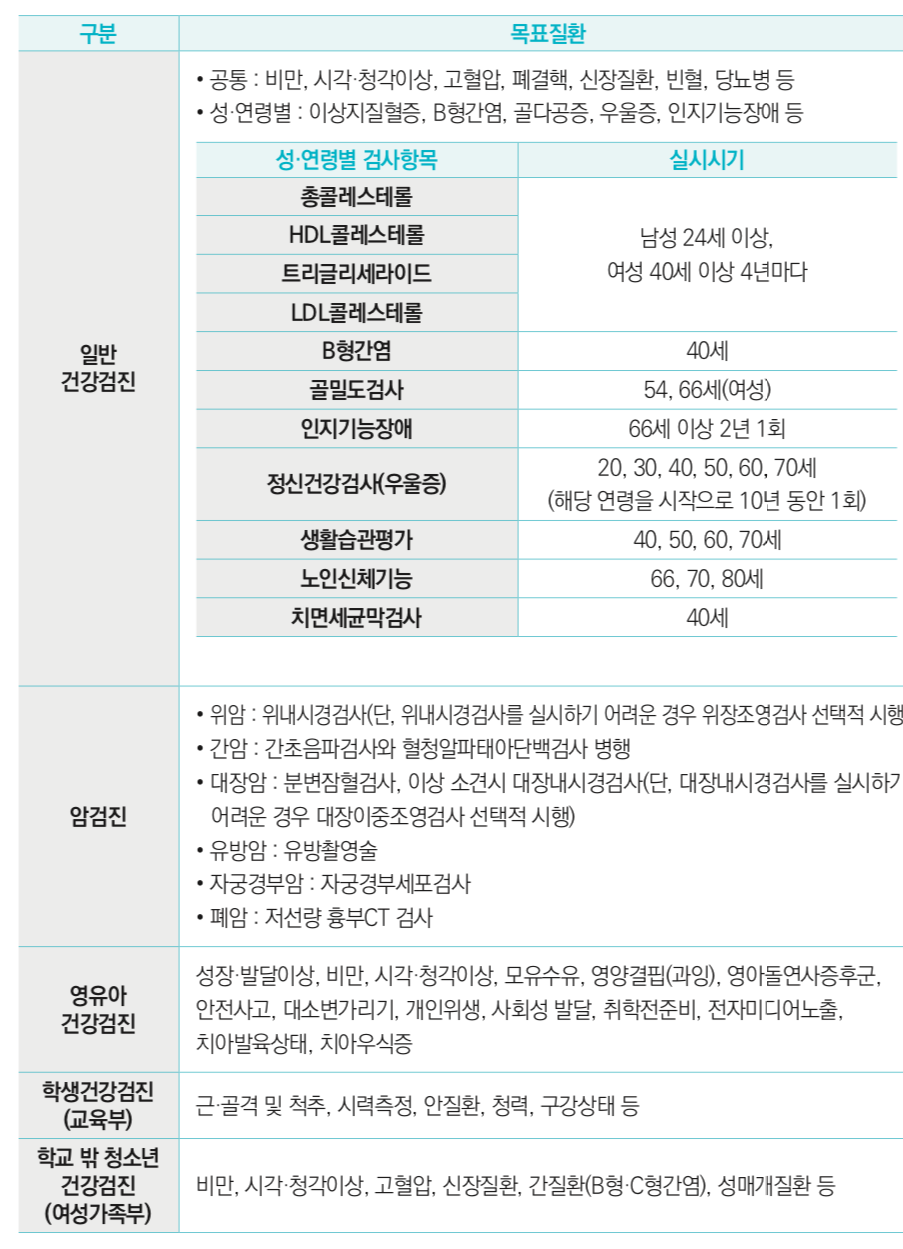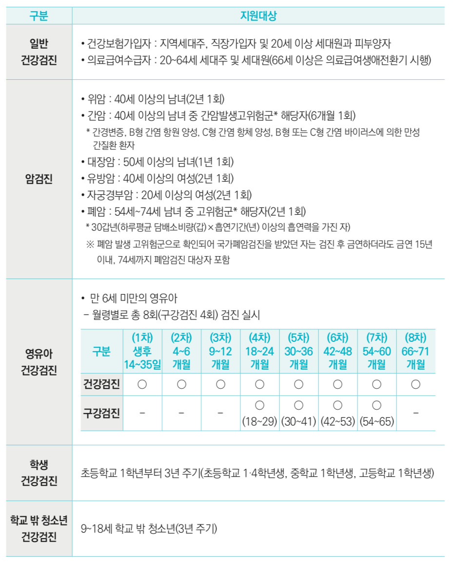 건강검진제도는 비만, 시각·청각이상, 고혈압, 폐결핵, 신장질환, 위암, 간암, 대장암, 폐암, 유방암, 자궁경부암 등 여러 질병에 대해 무료로 검진해주는 제도이며, 지원 대상은 지역세대주, 직장가입자 및 20세 이상 세대원과 피부양자, 20~64세 세대주 및 세대원입니다. 오늘 포스팅에서는 건강위험요인과 질병을 조기에 발견하여 적정한 치료를 받고 건강한 삶을 영위할 수 있도록 지원하는 제도들을 알려드리니 꼭 끝까지 열람하시길 바랍니다.