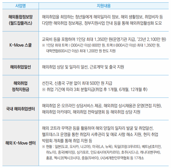 청년 해외 취업 지원 은 해외취업 희망 청년을 대상으로 맞춤형 연수과정(K-Move 스쿨), 해외 취업정보제공, 취업알선 등을 통해 해외취업으로 연계 지원을 하는 제도인데요, 대상은 만 34세 이하, 해외 취업을 희망하는 청년 누구나 대상입니다. 이 외에도 청년 내일 채움 공제 등 다양한 제도가 있으니 꼭 끝까지 열람 바랍니다.