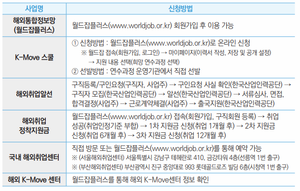- 해외 취업 연수사업(K-Move 스쿨)은 국내 외 우수 교육훈련기관 및 대학 등이 연수 운영기관으로 참여하여 양질의 해외 일자리를 선(先) 발굴한 후 해외 취업 희망자를 대상으로 연수를 실시하고 연수 과정 수료 후 해외 취업으로 연계해 주는 사업입니다. 해외 통합정보망 월드 잡플러스(www.worldjob.or.kr)에 회원으로 가입하시면 연수생을 모집 중인 과정을 검색하실 수 있으며 희망하시는 연수 과정을 신청하실 수 있습니다. 다만, 연수기관의 정원 규모에 따라 모집이 조기 마감될 수도 있으며 다수의 신청자가 있는 경우 연수생 선발 과정이 있을 수 있습니다.