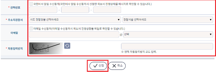 5) 전화번호 및 주소지 경찰서 입력 후, 이메일과 자동입력방지를 입력 후 신청하기 버튼을 클릭합니다.