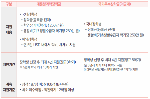 • 대통령과학장학금 : 국내 4년제 대학(자연과학 및 공학계열 학과(부))에 재학 중인 신입생 및 3학년 또는 해외 4년제 대학(자연과학 및 공학계열 학과(부))에 입학 예정 및 확정인 신입생