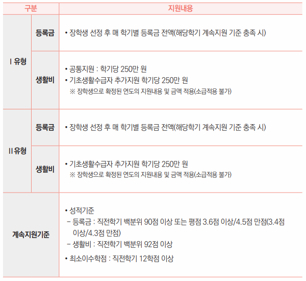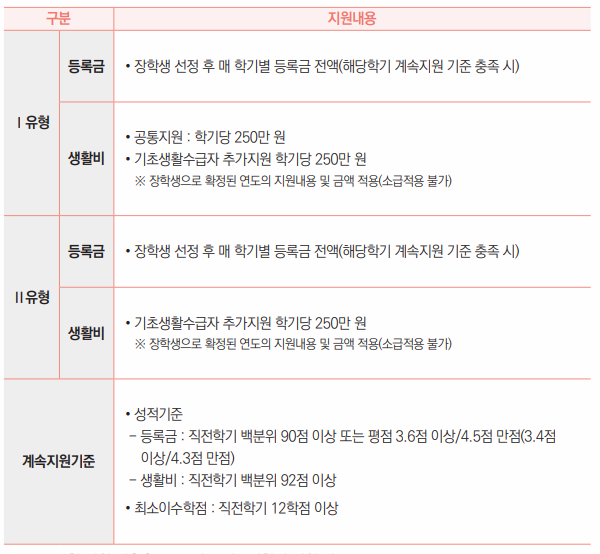※ Ⅰ·Ⅱ유형 지원 내용은 2023년도 신규 장학생 지원 기준