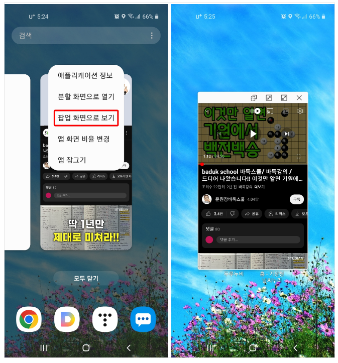 팝업 모드란 동영상을 소형 플레이어로 축소하여 컴퓨터나 휴대폰에서 다른 앱을 사용하는 동안에도 계속 시청할 수 있도록 도움을 주는 기능입니다. 유튜브 프리미엄 사용자는 설정에서 팝업 모드를 사용할 수 있지만, 일반 사용자는 유튜브 앱 내에서 팝업 모드를 사용할 수 없습니다. 하지만 갤럭시에서 지원하는 팝업 화면으로 보기 기능을 통해 유튜브 팝업 모드와 동일한 방식으로 팝업 모드를 사용할 수 있습니다. 오늘은 그 방법에 대해 함께 알아보도록 하겠습니다.