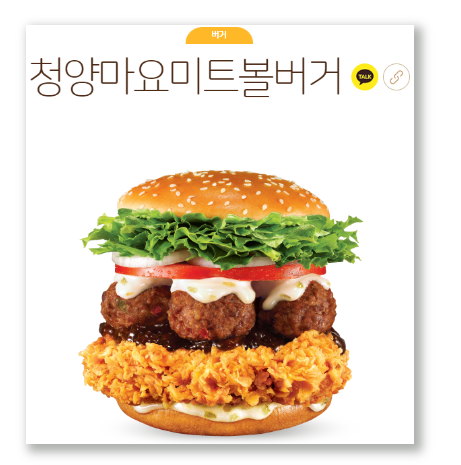 두툼하고 촉촉한 미트볼과 은은하면서 매콤한 통닭다리살 패티가 함유되어 입안 가득 촉촉한 육즙이 가즉 느껴지며, 고소하면서 살짝 매콤한 청양마요소스가 조화를 이루는 버거입니다. 이색적인 느낌이 들면서 맛이 좋으니 청양고추의 알싸함을 느끼시고싶으신 분들께 추천드리며, 청양마요가 싫으신 분들께서는 오리지널 미트볼 버거도 있으니 참고하시길 바랍니다. 799kcal / 당류 18g / 포화지방 15.7g / 단백질 36g 으로 당류와 열량이 조금 높은 편입니다.